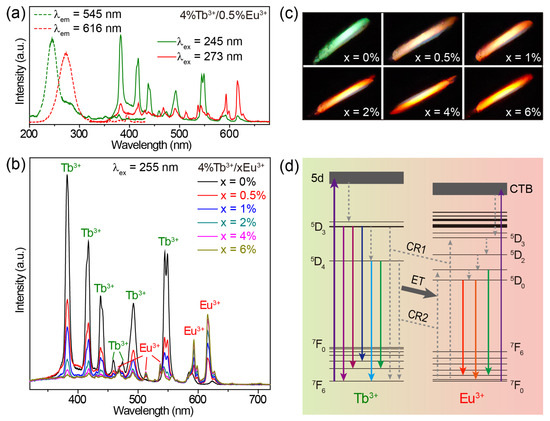 When co-doping Tb3+ and Eu3+ ions into CaZrO3, we obtained the emissions of Tb3+ and Eu3+ simultaneously in a single material. The excitation spectra of CaZrO3:4%Tb3+/0.5%Eu3+ monitoring the 545 nm emission of Tb3+ and the 616 nm emission of Eu3+ show two broad excitation bands centered at 245 and 273 nm, respectively (Figure 4a). These two bands were almost identical to the excitation bands in Tb3+-singly-doped and Eu3+-singly-doped CaZrO3; therefore, it is reasonable to allocate them to the 4f–5d transitions of Tb3+ and the O2− → Eu3+ charge transfer transitions, respectively. The excitation band at 245 nm for Tb3+ 545 nm emissions showed no shift in peak position, but only a decrease in intensity when the concentration of Eu3+ was increased from 0.5% to 6% (Figure S6a), because doping Eu3+ induces the gradual weakening of Tb3+ luminescence. The increase in the excitation band, which was around 273 nm for Eu3+ 616 nm emissions, implies an opposite trend regarding Eu3+ emission intensity (Figure S6b). To obtain intensity-comparable luminescence from both Tb3+ and Eu3+, we selected 255 nm, approximately located at the intersection of the two excitation bands, as the excitation wavelength to obtain the emission spectra.