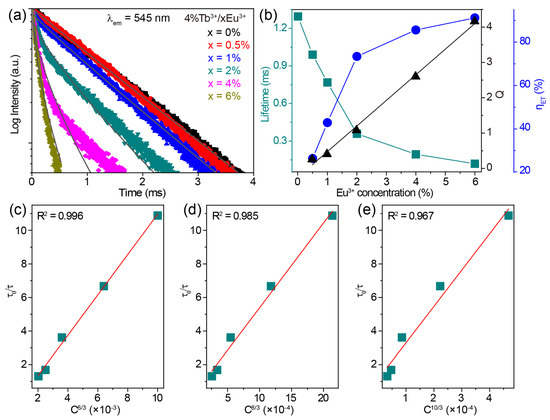 To determine the energy transfer mechanism, the critical distance between Tb3+ and Eu3+ was calculated to be 14.00 Å using the Equation (1), indicating that the multipole–multipole interaction dominates the energy transfer processes. The following formula for the relationship between the lifetime and the doping concentration was used to further disclose the mode of multipole–multipole interaction [51]: