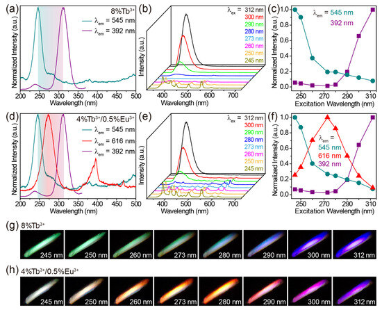 (a) Excitation spectra of CaZrO3:8%Tb3+, obtained by monitoring emissions at 545 and 392 nm. (b) Emission spectra and (c) intensity variation of CaZrO3:8%Tb3+ under 245–312 nm excitations. (d) Excitation spectra of CaZrO3:4%Tb3+/0.5%Eu3+, obtained by monitoring emissions at 545, 616 and 392 nm. (e) Emission spectra and (f) intensity variation of CaZrO3:4%Tb3+/0.5%Eu3+ under 245–312 nm excitations. Digital photographs show the color evolution of (g) CaZrO3:8%Tb3+ and (h) CaZrO3:4%Tb3+/0.5%Eu3+ under different excitation wavelengths.