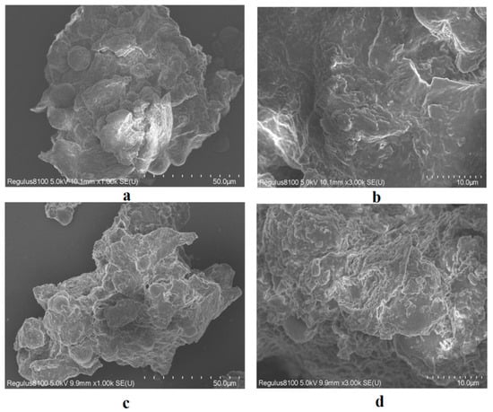 SEM images of the M. fragrans powder before and after processing. (a) Images of M. fragrans powder at 1000 magnification. (b) Images of M. fragrans powder at 3000 magnification. (c) Images of M. fragrans powder after processing at 1000 magnification. (d) Images of the M. fragrans powder after processing at 3000 magnification.