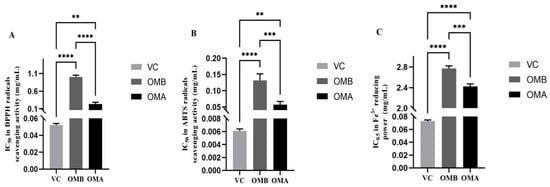 (A–C) represent the antioxidant capacities of OMB and OMA against DPPH radicals, ABTS·+ and Ferric reducing antioxidant power (FRAP), respectively. The significance of the difference between the two sets of data is represented as ** p < 0.01, *** p < 0.001, **** p < 0.0001, respectively.
