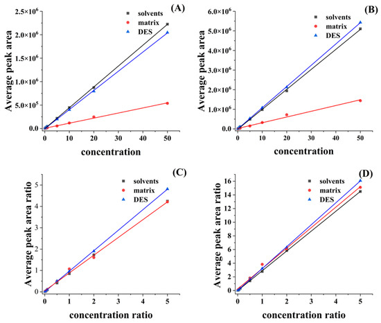 In this study, the matrix effect between the capsicum extract and the solvent, as well as between the DES involved in the extraction and the solvent, was evaluated in the detection of OTA and OTB. The standard curves evaluated were set up at seven concentration levels (from 0.1 to 50 ng/mL); each experiment was repeated three times; and the results are shown in Table 2. The corresponding standard curves are shown in Figure 3.