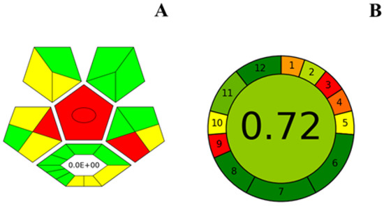 Result of the complexGAPI (A) and AGREE (B) analysis of the DES-DLLME-HPLC-MS/MS methodology.