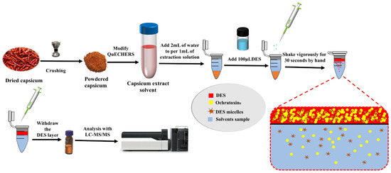 In a polypropylene test tube, 3 mL of pure water was added to every 1mL of capsicum extract. After that, 100 μL of DES solution was added and shaken vigorously by hand for 30 s, waiting for the solution to stratify, and the upper DES phase was aspirated using a pipette and loaded into the injection vial before entering the LC-MS system for analysis. The relevant operation is shown in Figure 5.