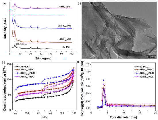 One of the most frequently used inorganic pillaring agents is multivalent polyhy-droxyl-Al3+ cations [17,18]. The polycations can be effectively intercalated into the interlayer spaces of the clay mineral by substituting the exchangeable charge-compensating cations. Followed by dehydration and dihydroxylation, stable Al oxide pillars will form between the layers with permanently enlarged interlayer spaces, which is so-called Al-PM. The interlayer spacing, pore volume, specific surface area, and thermal stability of the Al-PM can be further improved by introducing mixed-oxide pillars, such as AlFe, AlCu, AlSi, AlTi, AlGa, AlZr, AlNi, etc. [19,20,21]. The study of the preparation of AlMn–PMs has been rather scarce regarding its lower doping efficiency with Al oxides pillars. In addition, Mn and its compounds have been widely used as catalytic species for many organic reactions in homogeneous phase [19].