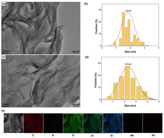 The phase behavior was further studied by the HRTEM characterization. As shown in Figure 3a,b, nanosized Pd particles (average size of about 1.8 nm) disperse well, mainly in the interlayer spaces of CS/AlMn0.15-PM supports. Pd@PVP/AlMn0.15-PM shows similar phase behavior but a bit larger in size of dispersed Pd nanoparticles (average size of about 2.3 nm). The HRTEM EDX-mapping results confirm the presence of the elements, such as C, N, O, Al, Si, Mn, and Pd, respectively (as shown in Figure 3e). In summary, these phenomena indicate that both CS chains and PVP chains have been successfully encapsulated in the interlayer spaces of the PM matrix. And CS chains show a bit of a higher promotion effect on the nanosized Pd species dispersion in the interlayer spaces of PM matrix than that of PVP chains. This should be attributed to the stronger chelation of CS chains to Pd species.