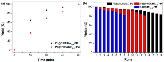 The catalytic performances of the prepared Pd@polymer/AlMn0.15-PM nanocomposite were evaluated with a Sonogashira reaction of aryl halides and terminal alkynes. Iodo benzene coupling with phenylacetylene was selected as model reaction. The appropriate reaction conditions were adopted from our former works, such as DMSO as solvent, ethylene glycol as reductive additives, and a reaction temperature of 90 °C. Under the optimized reaction conditions, the activity of the catalytic nanocomposites was monitored vs the reaction time. As shown in Figure 4a, as catalyzed by Pd@CS/AlMn0.15-PM, the model reaction yields reached 65% (15 min), 87% (30 min), 93% (45 min), and 100% (60 min), respectively, exhibiting excellent catalytic efficiency. For comparison, the corresponding yields after same reaction time as catalyzed by Pd@CS/Al-PM were seen as 37% (15 min), 69% (30 min), 84% (45 min), and 99% (60 min), respectively. Clearly, Pd@CS/AlMn0.15-PM shows better catalytic efficiency than Pd@PVP/AlMn0.15-PM. The Pd@CS/AlMn0.15-PM had higher adsorption performances than Pd@PVP/AlMn0.15-PM, which was confirmed in the above N2 adsorption–desorption characterization results. In addition, Pd nanoparticles with a smaller size in the case of Pd@CS/AlMn0.15-PM is beneficial for better catalytic activity performances. The Pd@polymer/AlMn0.15-PM nanocomposites are convenient for separation from the reaction medium, and reused in next reaction run. Figure 4b shows the relationship between the yield of the reaction and recycling runs of the catalytic materials, such as Pd@CS/AlMn0.15-PM, Pd@PVP/AlMn0.15-PM, and Pd@AlMn0.15-PM. To maintain a coupling yield higher than 80%, the nanocomposite can be reused for 17 runs (Pd@CS/AlMn0.15-PM), 13 runs (Pd@PVP/AlMn0.15-PM), or 8 runs (Pd@AlMn0.15-PM). Overall, although the intercalated polymer chains will sacrifice the surface area of the catalyst, the encapsulation of the N-containing polymer chains, which can form strong chelation to the Pd nanoparticles, is beneficial for the improvement of the recycling stability of the heterogeneous catalyst. In addition, PVP chains have good solubility in polar solvents [26,27]. The reason for the better performances of the Pd@CS/AlMn0.15-PM catalyst should be attributed to its stronger chelation with Pd species and better solvent resistance.
