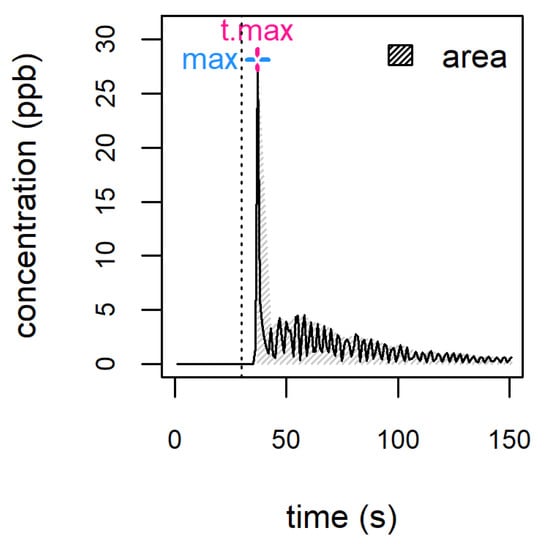 After wine is swallowed, the opening of the epiglottis and the velum–pharynx barrier allows VOCs to travel from the mouth to the olfactory epithelium; in a later phase, VOCs released from liquid remainders adhering to the mouth and throat mucosal surfaces sustain perception over time. This mode of perception is labelled ‘retronasal’ and generally follows orthonasal perception. The possibility of employing DIMS to analyse ’in vivo’ aroma release was first explored by developing a dedicated APCI-MS source [42]. The technique, generally referred to as ‘nosespace’ analysis, is performed by connecting the instrument inlet to the assessor’s nose by means of a custom nosepiece. The results typically obtained consist of time-resolved release profiles (Figure 3); from these, some key metrics of particular significance can be extracted (e.g., ‘area’, ‘maximum’ or ‘t.max’) and used to provide an analytical determination capable of supporting the description of the evolution of perception over time. It is important to note that, due to ethanol sample dilution naturally occurring in the oral and nasal cavities, measurement can be conducted under standard instrumental conditions.