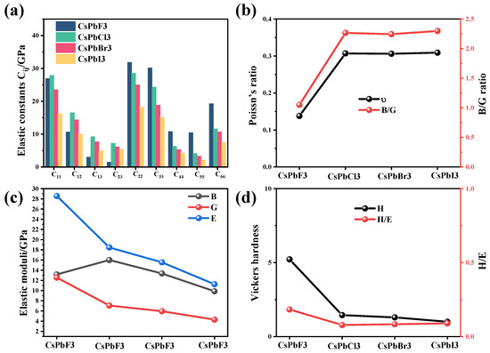 (a) Elastic constants, (b) Poisson’s ratio and B/G, (c) modulus of elasticity and (d) hardness and H/E for CsPbX3 (X = Cl, Br, I). Bulk modulus (B), shear modulus (G), Young’s modulus (E), Poisson’s ratio (ν) and hardness (H).