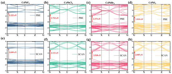 Figure 2 shows the energy band structure of CsPbX3. The band gaps of CsPbF3, CsPbCl3, CsPbBr3 and CsPbI3 obtained using the PBE method are 3.222 eV, 2.722 eV, 2.174 eV and 1.816 eV, respectively (Figure 2a–d), while the band gaps calculated using the SCAN method are 3.600 eV, 3.111 eV, 2.538 eV and 2.085 eV, respectively (Figure 2e–h). Furthermore, as can be seen in Figure 2, the minimum value of the conduction band (CB) and the maximum value of the valence band (VB) in all four structures are obtained near the G point, which characterizes the band gap structure as a direct band gap.