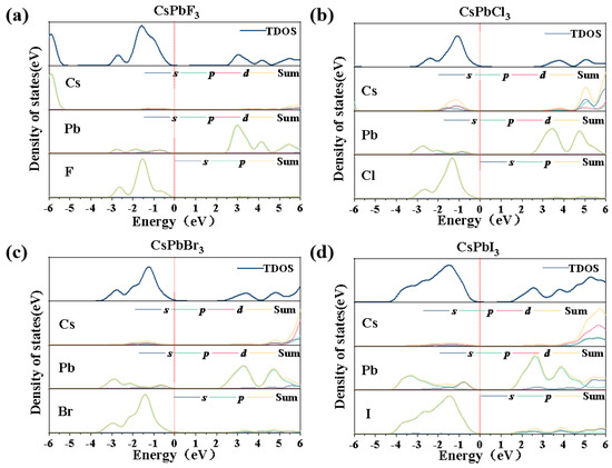 Densities of states and fractional-wave densities of states for (a) CsPbF3, (b) CsPbCl3, (c) CsPbBr3, (d) CsPbI3.