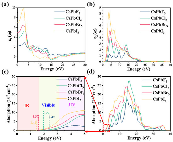 The real part ε1 and imaginary part ε2 curves of the dielectric function of CsPbX3 with energy are shown in Figure 4a,b. The imaginary part of the dielectric function is related to the electronic transition, so the imaginary part of the dielectric function can reflect the strength of the electron-stimulated transition and thus indicate the strength of the optical absorption capacity. The peaks of ε1 and ε2 are distributed in the low-energy region (≤15 eV). In the high-energy region (>15 eV), ε1 tends to 1 and ε2 tends to 0. Currently, CsPbX3 absorbs very few incident photons and has a high transmittance. The values on the vertical axis at zero energy are the static dielectric constants of the materials, which are 2.22, 3.81, 4.97 and 6.95 for CsPbF3, CsPbCl3, CsPbBr3 and CsPbI3, respectively (Figure 4a), showing a gradual increase in the static dielectric constant. With the replacement of different halogen elements, the static permittivity function gradually increases, which is due to the band gap value gradually decreasing. Furthermore, electrons require very little energy to jump from the top of the valence band to the bottom of the conduction band and are easily polarized.