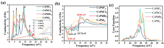 (a,b) Conductivity and (c) loss functions of CsPbX3 (X = F, Cl, Br, I).