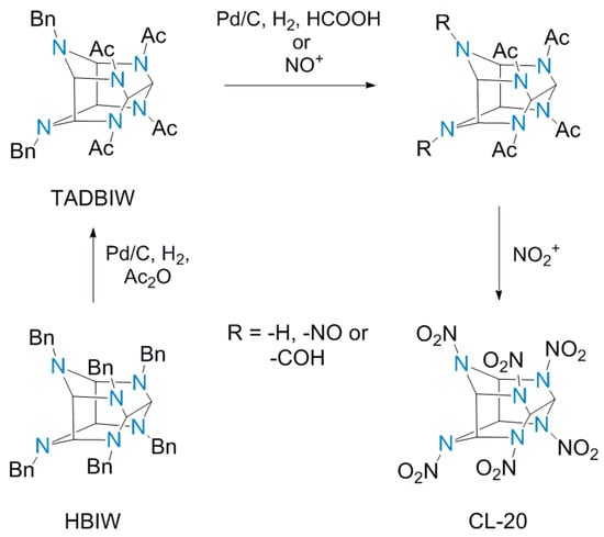 The first works that focused on the synthesis of caged nitramines incorporating oxaazaisowurtzitane cages appeared in the early 1980s but did not gain publicity [,]. The publicly available studies on the synthesis of the compact strained compound, 2,4,6,8,10,12-hexabenzyl-2,4,6,8,10,12-hexaazatetracyclo[5.5.0.03,11.05,9]dodecane (2,4,6,8,10,12-hexabenzyl-2,4,6,8,10,12-hexaazaisowurtzitane, HBIW), and on its nitration to 2,4,6,8,10,12-hexanitro-2,4,6,8,10,12-hexaazatetracyclo[5.5.0.03,11.05,9]dodecane (2,4,6,8,10,12-hexanitro-2,4,6,8,10,12-hexaazaisowurtzitane, CL-20) (Figure 1 and Scheme 1) appeared in the mid-1990s only [,,,,]. The energetic performance of CL-20 aroused an extreme interest of specialists engaged in the synthesis of HEDMs. CL-20 exhibits one of the highest detonation velocities (V0D = 9.36 (ε) km/s) among all explosives and the highest density among the known nitramines (ρ = 2.044 g/cm3) [,,,,], as well as a positive enthalpy of formation (ΔHf = 454 kJ/mol), optimal oxygen balance (−11.0) and detonation pressure (420 kbar) [,,,,,]. CL-20 is superior to other high-energy explosive materials such as HMX, RDX, PETN, etc., CL-20 is touted as a potential component of solid propellants [,,,,,,,,,] and composite explosives [,,,,,,,,,,,,,,,,].