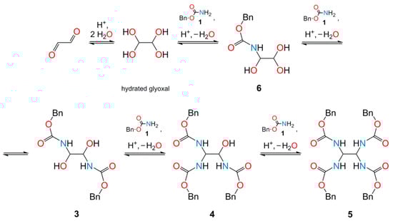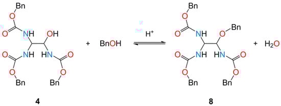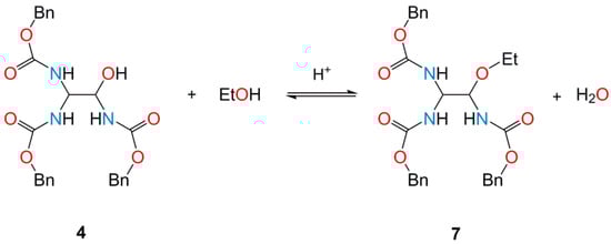 Three byproducts were isolated in addition to the condensation products of carbamate 1 with glyoxal. N,N′,N″-tris(carbobenzoxy)-2-ethoxyethan (7) was obtained in Et2O and AcOEt, which is a condensation product of compound 4 with EtOH (Scheme 4). EtOH required for the formation of this compound was formed by the hydrolysis of the solvents in the reaction mixture.