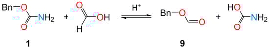 The condensation between carbamate 1 and glyoxal in FoOH did not almost take place. The major reaction product was a re-esterification product of benzyl formate (9) (Scheme 6). The process proceeded actively even without additional acidification with FoOH.