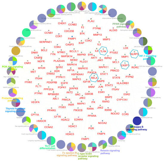 Results of the Kyoto Encyclopedia of Genes and Genomes (KEGG) pathway analysis. The core targets of the EAdSc component and UC are labeled in red font in the figure, while the targets within the blue hexagonal boxes are the core targets selected for validation in subsequent animal experiments in this study. The signaling pathways obtained by enrichment are presented as circles.