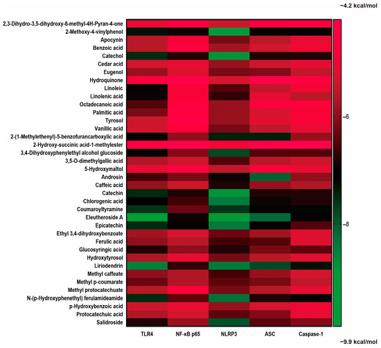 Results of molecular docking analysis of small-molecule compounds found in the ethyl acetate extract from decoction of Sargentodoxa cuneata (EAdSc) with the key proteins (TLR4, NF-κB-p65, NLRP3, ASC, and Caspase-1) of the TLR4/NF-κB/NLRP3 signaling pathway. The darker green color in the heatmap means that the compound has a strong affinity for the target, and the darker red color means that the compound has a weak affinity for the target.