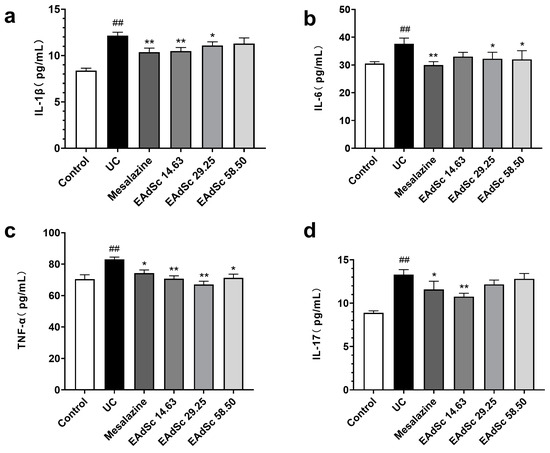 Levels of IL-1β, IL-6, TNF-α, and IL-17 in the colon tissues of the UC group were remarkably elevated compared to those of the control group (p < 0.01) (Figure 6). EAdSc (58.50 mg/kg, 29.25 mg/kg, and 14.63 mg/kg) treatment significantly reduced the expression of TNF-α in the colon tissues of UC animals (p < 0.05) (Figure 6c). In addition, 58.50 mg/kg and 29.25 mg/kg treatments of EAdSc significantly decreased the expression of IL-6 in the colon tissues of the animals (p < 0.05) (Figure 6b). Finally, treatment with 14.63 mg/kg of EAdSc significantly downregulated the expression of IL-1β and IL-17 in the colon tissues (Figure 6a,d). EAdSc has a good inhibitory effect on UC intestinal inflammation, and regulating intestinal immunoinflammation when EAdSc is used to treat UC is an important measure.