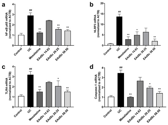 Compared to those of the control group, EAdSc (58.50 mg/kg) treatment decreased the expression of TLR4, NF-κB p65, NLRP3, and Caspase-1 mRNA in colon tissues (p < 0.05) (Figure 7). However, treatment with 29.25 mg/kg of EAdSc only decreased the expression of TLR4, NF-κB p65, and Caspase-1 mRNA in the colon tissues (p < 0.05) (Figure 7a,c,d). Finally, treatment with 14.63 mg/kg of EAdSc only reduced NLRP3 mRNA expression (p < 0.05) (Figure 7b). EAdSc significantly down-regulated gene expression of key targets in the TLR4/NF-κB/NLRP3 signaling pathway in UC colon tissues, suggesting that EAdSc inhibited the activation of the TLR4/NF-κB/NLRP3 signaling pathway. In addition, the results of animal experiments suggest that the “component–target–disease” network constructed in this study is highly reliable and can be used as a reference for subsequent studies.