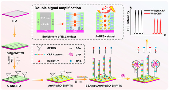 The construction of the aptamer-based sensor and ECL determination of CRP based on dual signal amplification are shown in Figure 1. Firstly, a layer of SNF is grown on the patterned ITO electrode surface using the Stöber solution growth method. The growth mechanism involves the self-assembly of siloxane precursors under the surfactant micelle (SM) template, resulting in SM within the nanochannels of the obtained electrode (SM@SNF/ITO). Subsequently, the electrode is epoxy-functionalized. Since the nanochannels are sealed by SM, the reaction occurs selectively on the outer surface of SNF, leading to the electrode being abbreviated as SM@O-SNF/ITO. The sealed SM prevents an epoxy reaction inside the nanochannels, avoiding a blockage of the nanochannels. After removing SM, open nanochannels are obtained (O-SNF/ITO).