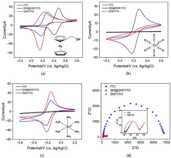 CV curves obtained on ITO, SM@SNF/ITO, and SNF/ITO in 50 mM KHP containing 0.5 mM (a) Fc-MeOH, (b) Fe(CN)63− and (c) Ru(NH3)63+. (d) EIS plots of SM@SNF/ITO and SNF/ITO in a 0.1 M KCl solution containing 2.5 mM Fe(CN)63−/4−. The scan rate in (a), (b) and (c) was 0.05 V/s.