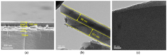 (a) SEM image of the cross-section of SNF/ITO. The cross-sectional (b) and top-view (c) TEM images of SNF.