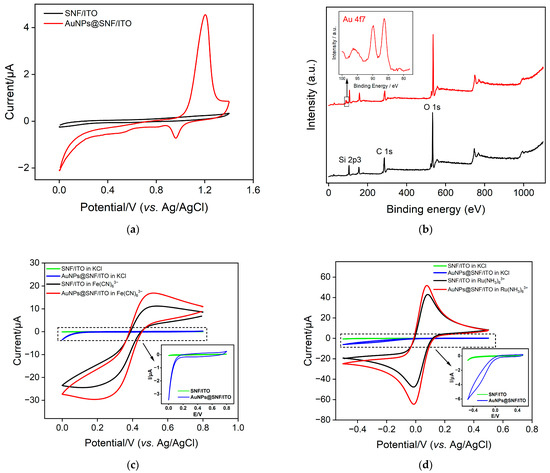 To confirm the successful deposition and localization of AuNPs, the SNF/ITO electrode before and after AuNPs’ deposition (AuNPs@SNF/ITO) was investigated using cyclic voltammetry (CV) and X-ray photoelectron spectroscopy (XPS). The CV curves of both electrodes are shown in Figure 4a. The SNF/ITO electrode exhibits virtually no signal in 0.1 M of sulfuric acid, while AuNPs@SNF/ITO shows characteristic oxidation-reduction peaks of gold at 1.18 V and 0.96 V, respectively. In comparison with SNF/ITO, characteristic peaks of Au4f appear in the XPS spectrum for AuNPs@SNF/ITO, further confirming the successful modification of AuNPs (Figure 4b). Figure 4c,d show the CV curves of SNF/ITO and AuNPs@SNF/ITO electrodes in the absence or presence of different probe solutions. It can be found that the charging current and peak current of the AuNPs@SNF/ITO electrode are higher than those of the SNF/ITO electrode for both positive and negative probes. This indicates that the accessible electrode area is improved after the modification of AuNPs.