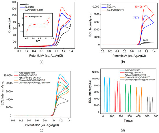 After blocking non-specific sites with BSA, the electrode surface was covered with a non-conductive, large-sized protein layer, further impeding the transfer of probes and electron transfer, resulting in a further decrease in the ECL signal of BSA/Apt/AuNPs@O-SNF/ITO. In the presence of CRP, the formation of complexes due to CRP binding to the aptamer further hindered probe transfer and electron transfer, causing a significant reduction in the ECL signal. These results confirm the successful construction of the aptasensor and the feasibility of CRP detection.