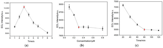 To achieve high detection performance of the fabricated aptasensor, certain relevant conditions for the experiment were optimized. The deposition time of AuNPs, the concentration of the aptamer for the fabrication of the recognitive interface, the incubation time for CRP, and the results are shown in Figure 7. As observed in Figure 7a, compared to the electrode without AuNPs (deposition time of 0 s), the ECL signals of the electrode exhibit an initial increase followed by a decrease as the AuNPs deposition time increases. The increase in ECL signal is attributed to the enhanced electrode active surface area due to the presence of AuNPs, which also catalyze the ECL luminescence process. As a prolonged deposition time may lead to blockage within the nanochannels, resulting in reduced enrichment of Ru(bpy)32+ by the nanochannels and subsequently a decrease in the ECL signal of the sensor, the optimal deposition time for AuNPs was chosen at 3 s (Figure 7a). The modification of the bio-recognitive interface is crucial for the fabrication of the aptasensor, taking into account both time and cost factors. When the incubation time for aptamer immobilization was fixed at 90 min [54], the aptamer concentration was optimized. As shown in Figure 7b, the fixed incubation time was 30 min, and ECL signal decreases with increasing aptamer concentration and stabilizes at around 0.3 μM. Further increasing the aptamer concentration only results in minimal changes in the ECL signal. Thus, the aptamer concentration of 0.3 μM was chosen as the optimal condition. Similarly, in the case of antigen concentration of 1 ng/mL, the optimal incubation time for CRP, as obtained through optimization, was 80 min (Figure 7c).