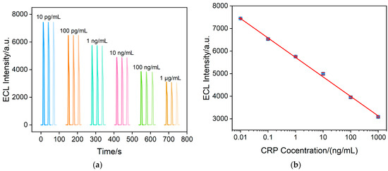 Under optimal conditions, the proposed aptasensor exhibits a negative correlation between ECL intensity and CRP concentration (Figure 8a). Commonly, logarithmic processing is usually performed on the electrochemical data to explore a good coefficient of determination across a wide concentration range [55]. As observed from Figure 8b, within the range from 10 pg/mL to 1 μg/mL, the ECL signal (IECL) demonstrates a linear relationship with the logarithm of CRP concentration (logCCRP). The corresponding linear regression equation (IECL = −863.3 logCCRP + 5717) exhibits a high linear correlation coefficient of 0.9995. The detection limit (DL) calculated using three signals to noise (S/N = 3) is 7.4 pg/mL. Comparison of CRP detection performance with other sensors is shown in Table S1 (SI) [18,56,57,58,59,60,61]. The LOD of the fabricated aptasensor is lower than that of electrochemical sensors using square wave voltammetry [56] or differential pulse voltammetry [57], or ECL immunosensors based on platinum nanowire/titania nanotube composites [58] or Ir(III) compound and β-cyclodextrin complex [59]. The LOD is higher than that of the ECL immunosensor based on the resonance energy transfer of Ru(bpy)32+@Cu3(HHTP)2 and graphene oxide-gold nanoparticles (GO-AuNPs) [60], an ECL immunosensor using Ru(bpy)32+-labeled AuNPs’ modified screen-printed electrode (SPE) combined with a flow measurement [61], or an electrochemical aptasensor based on AuNPs anchored in covalent poly deep eutectic solvent functionalized graphene-modified glassy carbon electrode (Apt/AuNPs/GO/PDES/GCE) [18]. However, the fabricated aptasensor does not conducted a complex preparation of nanocomposite materials or labelled bioligands and exhibits a wider detection range.