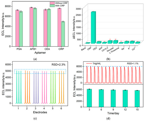 Other aptamers with an amino label, such as the AFB1 aptamer, PSA aptamer, and CEA aptamer, were employed to assess the specificity of the sensor. As shown in Figure 9a, only sensors modified with the CRP aptamer exhibit significant signal changes. Selectivity is also a crucial parameter for assessing sensor performance. Figure 9b displayed the change of ECL signal (ΔECL intensity) when the aptasensor incubated with CRP (10 ng/mL), or one (100 ng/mL) of the other tumor biomarkers (AFP or CA15-3) or substances (glucose, L-serine, Na+, K+ and Ca2+) found in serum. As observed, even the concentrations of other substances are ten times higher than that of CRP, and the change of ECL signal is very minimal. In contrast, a significant ECL change is observed when the aptasensor incubates with CRP because of the decrease in ECL signal resulting from the specific binding with aptamer, indicating that the aptasensor possesses excellent selectivity. Six aptasensors are individually fabricated to measure CRP, as shown in Figure 9c. The results indicated a relative standard deviation (RSD) of 2.3%, demonstrating excellent repeatability of the sensors (Figure 9c). As shown in the upper image in Figure 9b, when the electrode undergoes continuous electrochemical scanning, the RSD of the continuously measured ECL signals is only 1.1%, demonstrating high signal stability. Furthermore, even after 15 days of storage at 4 °C, the ECL intensity of the sensors remains at 85% of the initial signal, indicating excellent storage stability (the bottom image of Figure 9d).