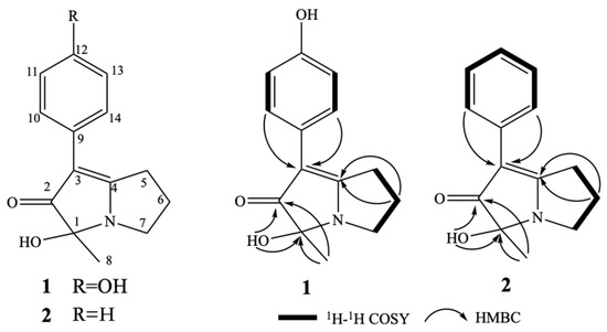 In our previous research, some bioactive secondary metabolites were isolated and identified from marine-derived Micromonospora. For example, three new isoflavonoid glycosides with moderate cytotoxic activity to the human lung carcinoma cell line A549, hepatocellular liver carcinoma cell line HepG2, and the human colon tumor cell line HCT116 were obtained from Micromonospora aurantiaca 110B [18]. A new derivative of diterpenoid with strong cytotoxicity against HCT-116 cells and moderate cytotoxicity against HepG2 cells and A549 cells was isolated from Micromonospora zhangzhouensis sp. nov. HM134 [23]. In the continuous efforts to discover bioactive chemical entities from marine Micromonospora, a marine Micromonospora sp. HU138 demonstrated antifungal activity against Botrytis cinerea. Further research on this strain, two previously undescribed pyrrolizine alkaloids, named phenopyrrolizin A (1) and phenopyrrolizin B (2) (Figure 1), were isolated from its cultures. Their isolation, structure characterization, and bioactivity are described in this paper.