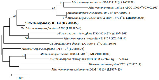 The 16S rRNA genes of the strain HU138 were sequenced and the sequence (NCBI GenBank accession No.: OR708545) was blasted against the sequences available in EzBioCloud data base. The matching result suggested that strain HU138 belonged to the genus Micromonospora and showed the highest sequence similarity to Micromonospora fluminis A38T (99.01%). The phylogenetic analysis based on a neighbor-joining tree (Figure 2) revealed that the strain HU138 fell within the cluster of the genus Micromonospora and formed a coherent clade with Micromonospora fluminis A38T. The clade had firm bootstrap support and represented an independent lineage. Similar results were obtained by using the maximum-parsimony and maximum-likelihood trees (see Figures S1 and S2 in Supplementary Materials).