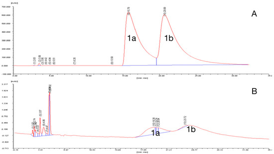 The enantiomeric analysis of compounds 1 (A) and 1a (B) by a Chiralcel OD-H column.