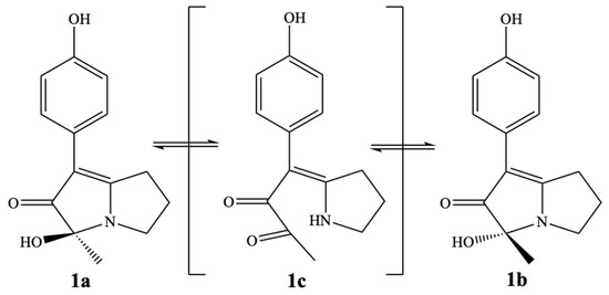 In order to obtain optically pure enantiomers for further research, compound 1 was analyzed by chiral-phase HPLC. Chromatographic analysis of 1 by a Chiralcel OD-H column using n-hexane/isopropanol = 80:20 (v/v) as the eluent suggested that 1 is a racemic mixture (1a and 1b) with an enantiomeric ratio of 1:1 (Figure 5A). However, efforts to obtain the enantiomers were not successful as the racemization occurred spontaneously in the isolation procedure (Figure 5B). We speculate that racemization of 1 takes place through a key tautomer (1c), as shown in Figure 6.