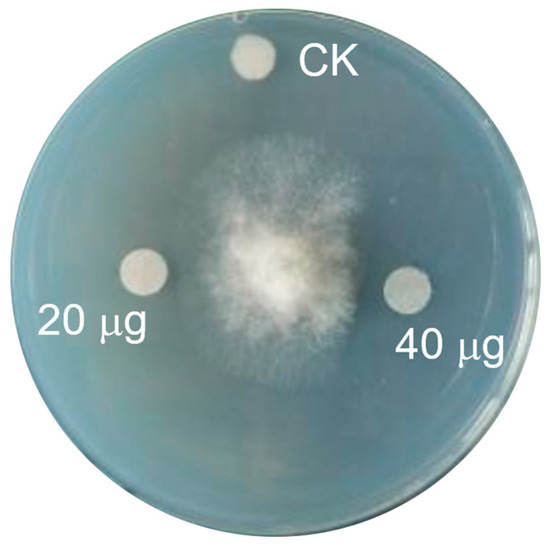 The antibacterial and antifungal activity assay showed that these two compounds exhibited no obvious inhibitory activity against the tested bacteria (Klebsiella pneumoniae, Escherichia coli, Enterococcus faecalis, Salmonella typhimurium, Pseudomonas aeruginosa, Ralstonia solanacearum, Xanthomonas oryzae, Pseudomonas syringae, and Staphylococcus aureus) and fungi (Fusarium oxysporum, Ustilago maydis, Cucumber fusarium, Fusarium moniliforme, Helminthosporium maydis, Alternaria alternata, Phoma foveate, and Magnaporthe oryzae). However, compound 2 could inhibit the mycelial growth of Botrytis cinerea, and demonstrated the inhibitory rates of 18.9% and 35.9% at 20 μg/disc and 40 μg/disc, respectively (Figure 7). Notably, compound 1 showed no antifungal activity against B. cinerea, suggesting that hydroxylation at C12 has a negative effect on the bioactivity. The cytotoxicity activity assay for compounds 1 and 2 showed that these two compounds exhibited no cytotoxicity activity to A549, HepG2, and HCT116 cells.