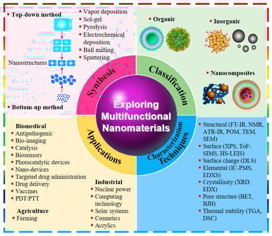 Diagrammatic illustration depicting synthesis, classification, characterization techniques, and applications of multifunctional nanomaterials.