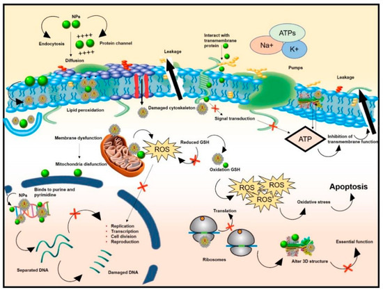 The cell wall and membrane play a crucial role in maintaining the stability of the substances in the bacteria and protect the bacteria from harm [155,156]. NPs with antibacterial properties can attach to the negatively charged cell membrane due to their positive charge when they come into contact with bacteria [157]. The integrity of the cell membrane is damaged, weakening the interaction between lipopolysaccharide layers on the outer membrane. As a result, most lipopolysaccharides and proteins are released from bacteria, enhancing cell permeability and affecting material exchange inside and outside the cell [158]. In addition, NPs can penetrate the bacterial outer wall and accumulate in their inner membrane, causing instability, damage, increased membrane permeability, cell contents leakage, and death. For example, Au-NPs can continuously release ions that adhere to cell walls and membranes, altering the membrane permeability and causing the destruction of the bacterial envelope. Au-NPs can also cause damage through electrostatic attraction with bacterial cell walls, resulting in cell wall rupture and bacterial death [159,160,161].