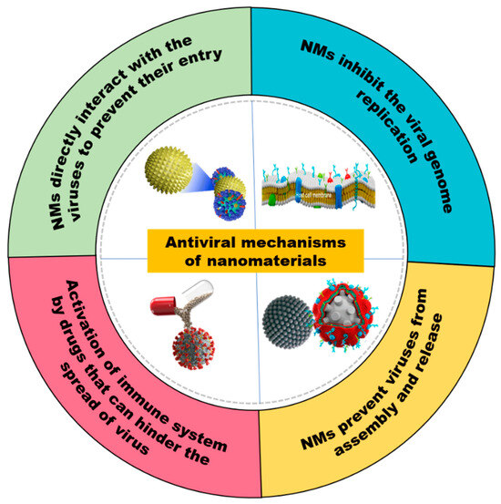 Upon entering a cellular environment, viruses undergo essential processes like unpacking, replication, and translation, leading to the production of RNA/DNA molecules and proteins [191]. The host immune system can be stimulated by two mechanisms with respect to viral entrance into the host cell: (i) directly by NPs or (ii) by coating NPs to the drugs. Azharuddin et al. [192] documented that Au-NPs can trigger immunological responses, including humoral and cell-mediated responses, and produce M2e-specific IgG serum antibodies to prevent the spread of influenza virus by regulating cytokine generation and stimulating immune cells. On the other hand, NPs can stimulate the immune system when combined with drugs, inhibiting viral replication and their spread [193]. Figure 3 provides a summary of the key methods for the various NM antiviral function mechanisms.