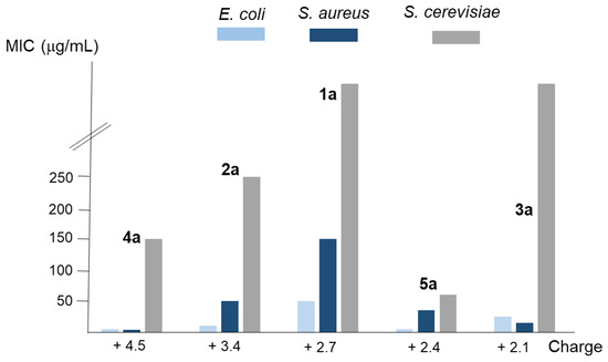 According to their topology, the studied polyamines can be classified as linear (1 and 2), tripodal (3 and 4), and macrocyclic (5). Moreover, regarding the whole charge that they have at physiological conditions (pH = 7.4), we found that compounds 1a, 3a, and 5a have between +2.1 and +2.7 charges; 2a has +3.4; and 4a has +4.5. In the case of both tripodal compounds (3a and 4a), or both linear ones (1a and 2a), the activity was higher in the derivative with an upper charge. However, the main factor determining the activity seems to be the topology, because comparing the three compounds with similar charge (1a, 3a, and 5a), higher activity is shown (except for S. aureus) by macrocyclic compound 5a followed by the tripodal one 3a (see Figure 2). Moreover, it was similar or higher for macrocyclic derivative 5a, with a whole charge of +2.4, than for the tripodal 4a and the linear 2a with charges of +4.5 and +3.4, respectively.