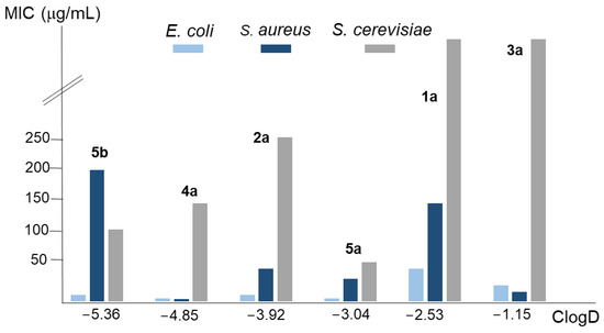 Analysis of the relationship between the average MIC values of the compounds considered in this work for the E. coli, S. aureus, and S. cerevisiae strains employed, and their ClogD values.