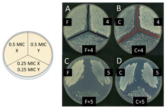 These results were confirmed by plating samples corresponding to the incubation of the microorganisms with concentrations corresponding to half of the MIC of every one of the antimicrobials and with a mixture of one-quarter of the MIC of both.