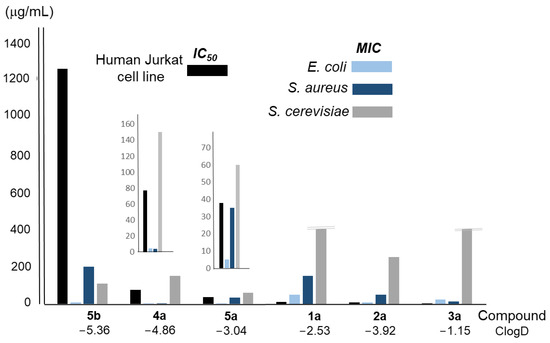 Analysis of the relationship between the average MIC and IC50 values of the compounds considered in this work, and their ClogD. Extended plots for 4a and 5a are also included to better appreciate the differences.