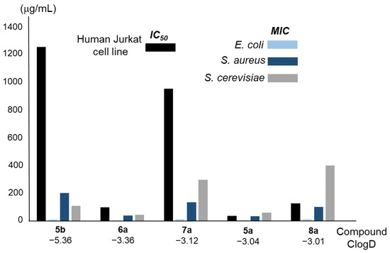Table 5 and Figure S7 in Supplementary Materials show the results of the viability assay carried out to determine the cytotoxicity of the conjugated compounds 1a–5a and the pure polyamine 5b on the human Jurkat cell line. As can be seen in Table 5, the most polar one, compound 5b (ClogD −5.36), showed the lowest cytotoxicity (IC50 1252 μg/mL), while the most lipophilic one, compound 3a (ClogD −1.15), was clearly the most cytotoxic (IC50 1.86 μg/mL). The remaining compounds showed intermediate cytotoxicity, with two different ranges of values, one for linear compounds 1a and 2a and the second one for compounds 4a and 5a. Figure 5 shows the IC50 values (black column) for each compound, together with the corresponding MIC values for the microorganisms considered (light blue, dark blue, and grey columns). Considering all these data together, macrocyclic polyamine 5b is the one that showed the highest therapeutic index in all cases. The conjugated polyamines 4a and 5a also presented acceptable values in E. coli, in contrast to the other compounds (1a, 2a, and 3a), which were found to be very toxic to human cells.