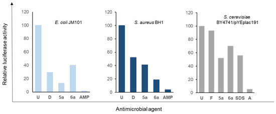 Determination of the ATP intracellular levels of cells treated with the compounds 5a and 6a for 20 h via bioluminescence. Experiments were carried out as described in the Materials and Methods section. Briefly, 50 OD600 units of yeast cultures and 1.5 OD600 units of bacterial ones were used. Experiments were carried out at least in triplicate and the presented data correspond to the normalisation of each average value to that found in untreated cells; the standard deviation was less than 5% in all cases. U—untreated cells, F—fluconazole, A—amphotericin B, D—doxycycline, and AMP—ampicillin.
