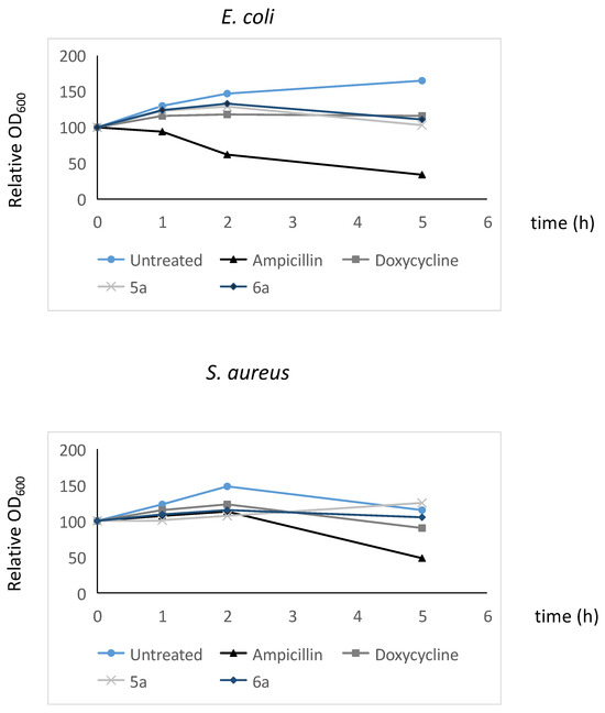 Regarding E. coli cells, the effect of all the compounds at five-fold MIC concentrations was a reduction in the ATP intracellular levels to 40% or less. This decrease was especially relevant in the case of the treatments with ampicillin and 5a, followed by doxycycline and 6a. For S. aureus, similar results were obtained, although in this case, 6a displayed a higher effect than 5a and doxycycline. These results confirm the important effect of 5a and 6a on cell metabolic activity in bacterial cells.
