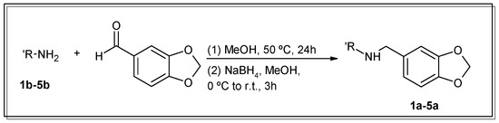 For the conjugation of the aromatic moiety, selective condensation between 3,4-methylenedioxybenzaldehyde (commonly known as piperonal or heliotropin) and the primary amino groups of the corresponding polyamine (1b–5b) in the proper stoichiometry was carried out. Then, the intermediate imine was reduced in situ with NaBH4 (Scheme 1). The purification to obtain spectroscopically pure compounds was easily achieved via simple precipitation and the recrystallisation of the hydrochloride salts.