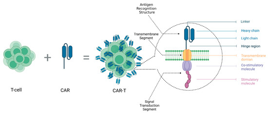Another therapy showing significant clinical outcomes is CAR-T-cell therapy, whose structure is depicted in Figure 1. CAR-T involves genetically engineering T-cells to express tumor-specific chimeric antigen receptors and infusing these modified T-cells into the patient, thereby enabling activated T-cells to kill tumor cells. Oncolytic virotherapy is another major type of immunotherapy, which infects and kills tumor cells using genetically engineered viruses. Simultaneously, this therapy can also trigger an immune response, further eliminating residual tumor cells.