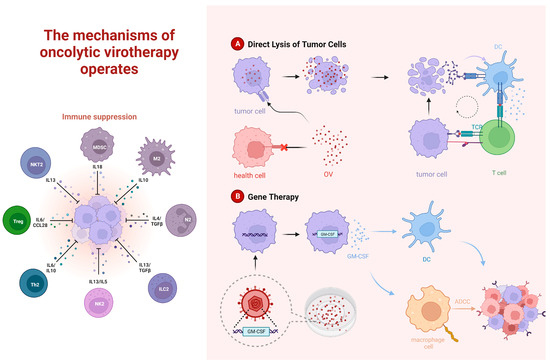 Tumors are capable of creating an immunosuppressive environment, effectively evading the surveillance of the immune system, and thereby facilitating growth, dissemination, and metastasis. For instance, they could alter their surface proteins to evade recognition by the immune system or secrete immunosuppressive molecules such as cytokines (like TGF-β and IL-10) to directly inhibit the activity of immune cells. Tumor cells can even recruit and activate certain immunosuppressive cells, such as regulatory T-cells (Tregs) and myeloid-derived suppressor cells (MDSCs). These cells can suppress immune cells, preventing them from attacking the tumor. Presently, OVs primarily employ two strategies to break through this immunosuppressive environment. (A), Direct cell lysis. OVs selectively infect tumor cells, leading to their lysis and the release of more antigens, which further intensifies the immune response and specifically induces tumor cell apoptosis. (B), Gene therapy. For example, OVs carrying the GM-CSF gene infect tumor cells in large numbers, causing the tumor cells to express GM-CSF. This recruits immune cells such as dendritic cells and macrophages, induces immune infiltration, and destroys pathogens or tumor cells that have been marked by antibodies.